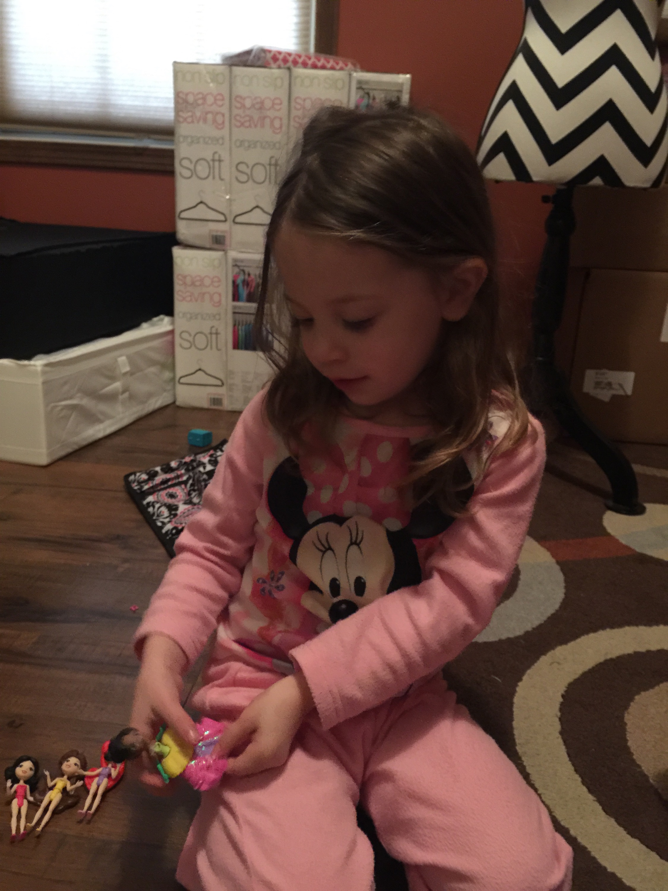 Above, a rare moment of baby sitting as the youngest grandchild presents each of her princesses to me with a colorful introduction. “Actually,” she explains, holding one tiny figure, “This is Princess Tiana, and she is very beautiful. Notice her colorful dress.”