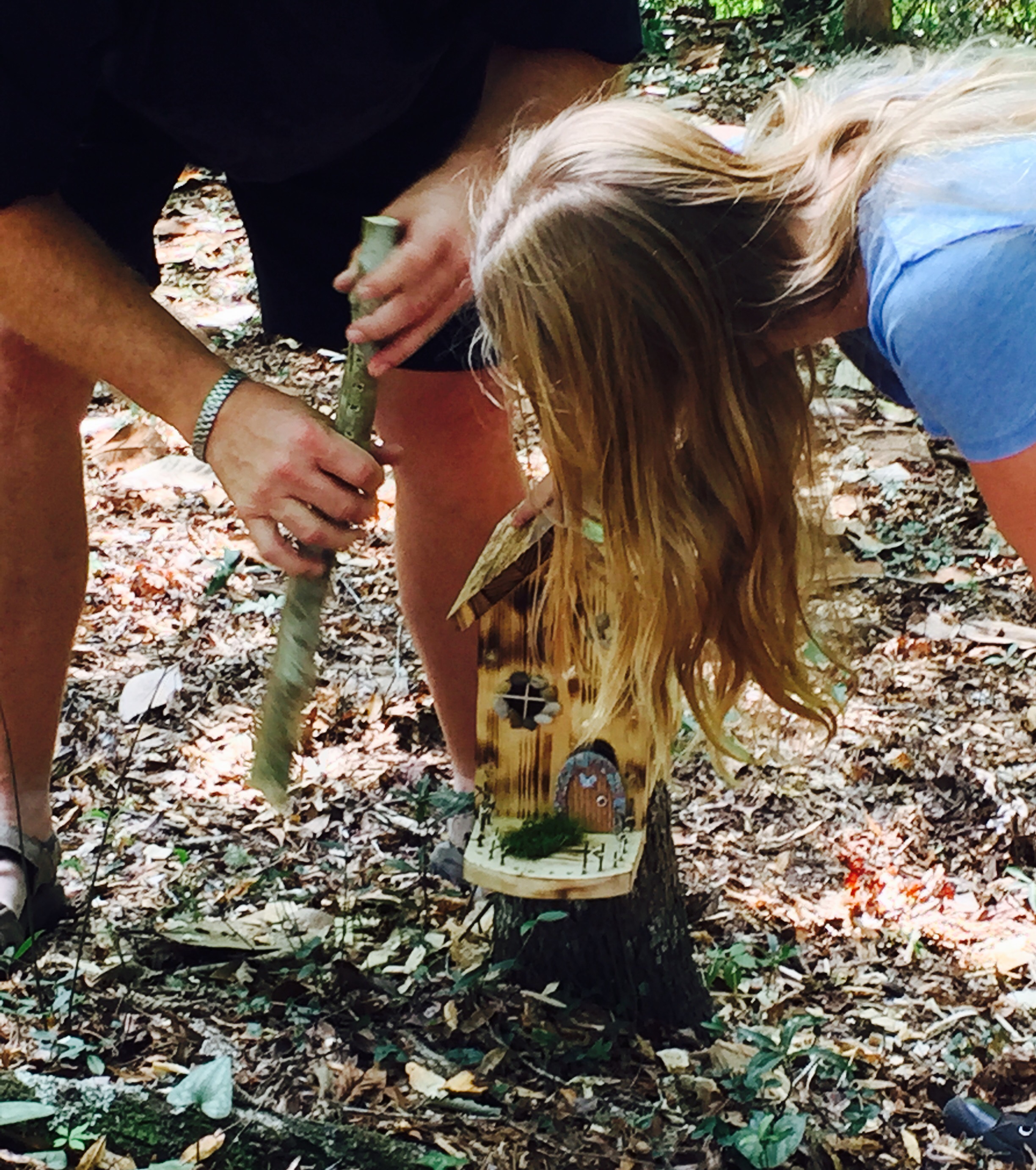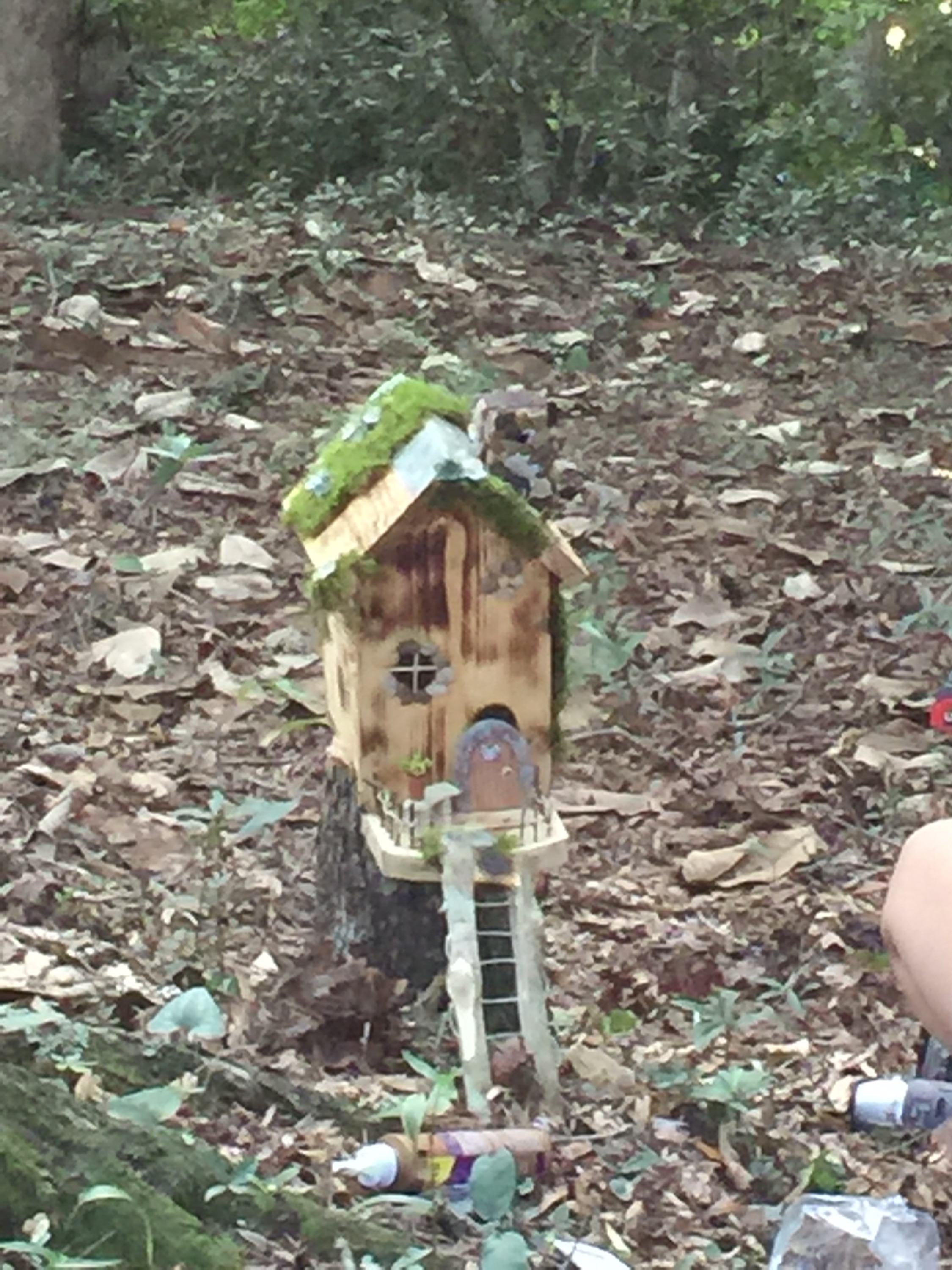 We completed work on our faerie home and placed it on a stump in our backyard. We checked on it first thing this morning, and sure enough, a family of wee folk had already moved in.