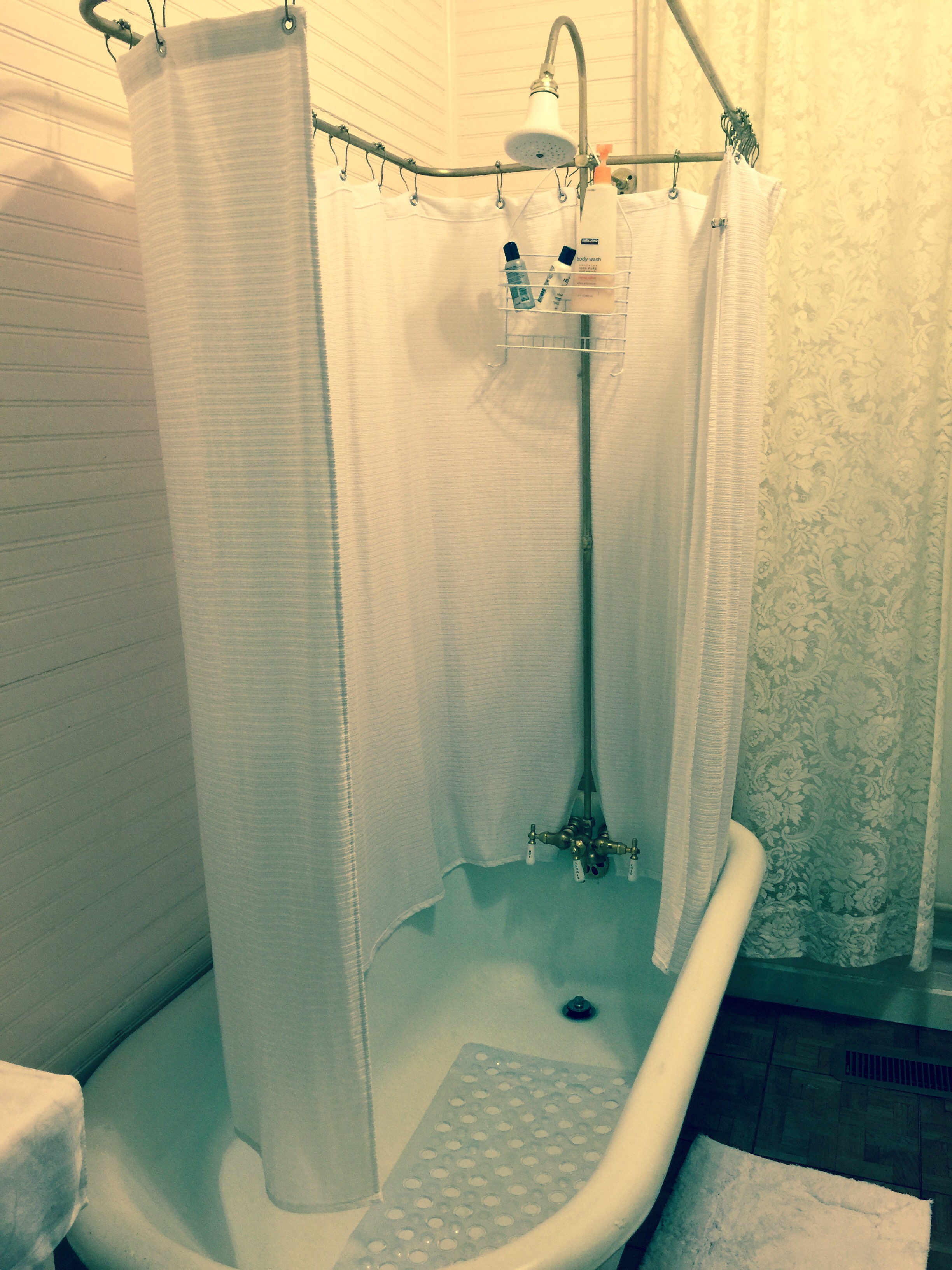 The claw foot bathtub made for an interesting, yet surprisingly efficient shower setting.