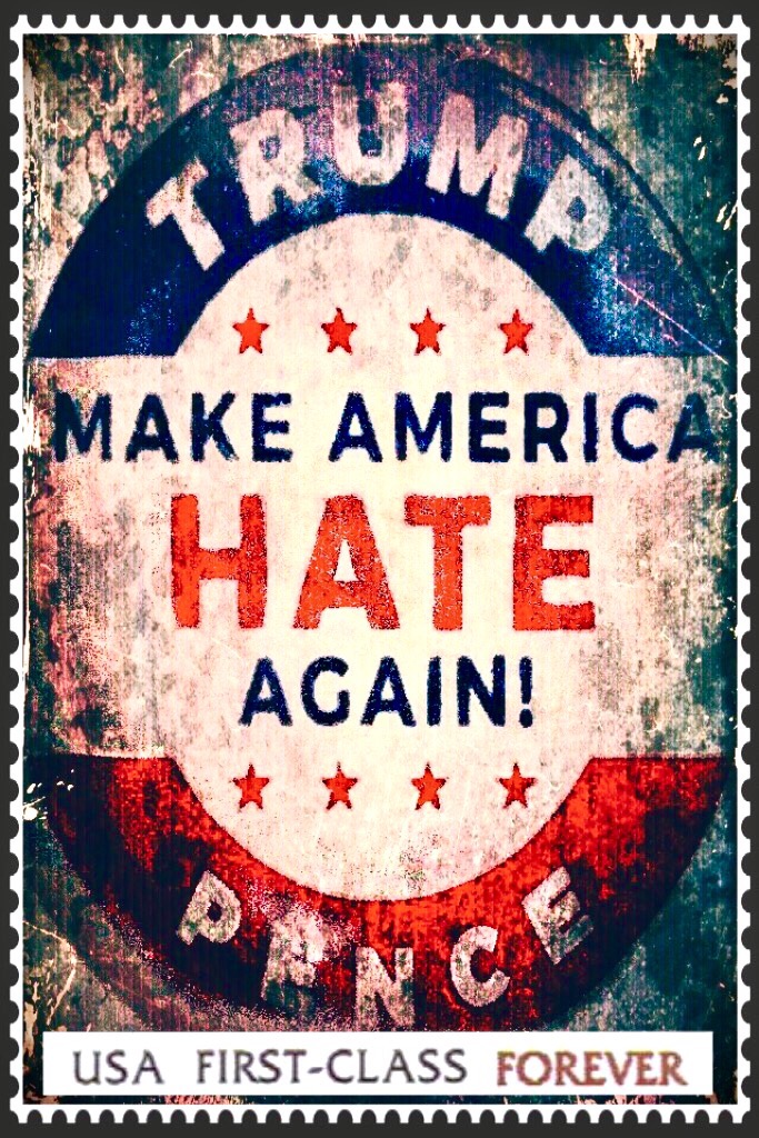 I have been staying out of most political conversations for months. Today, While I was driving around the county, providing community mental health services to people who would be most negatively impacted by a Trump Presidency, I realized that the Trump campaign signs needed editing to more accurately reflect the affect of his campaign on the state of interpersonal relations in this country. When I got home, I decided to make my feelings on this subject crystal clear by designing this postage stamp.