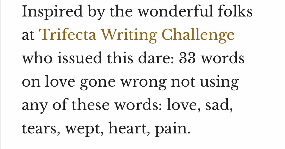 My friend Jan Wilberg at http://www.redswrap.wordpress.com inspired me to be inspired by a prompt on the Trifecta Writing Challenge: