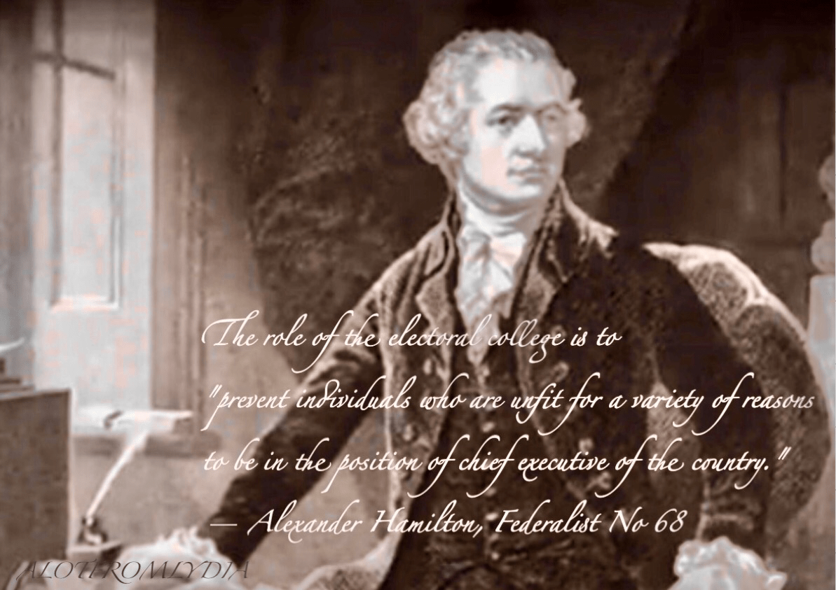Will they consider the clear purpose their position holds? According to Alexander Hamilton’s writings in the Federalist Papers, the electoral college was designed to ensure “that the office of President will never fall to the lot of any man who is not in an eminent degree endowed with the requisite qualifications.” The Electoral College exists to preserve “the sense of the people,” while at the same time ensuring that a president is chosen “by men most capable of analyzing the qualities adapted to the station, and acting under circumstances favorable to deliberation, and to a judicious combination of all the reasons and inducements which were proper to govern their choice.