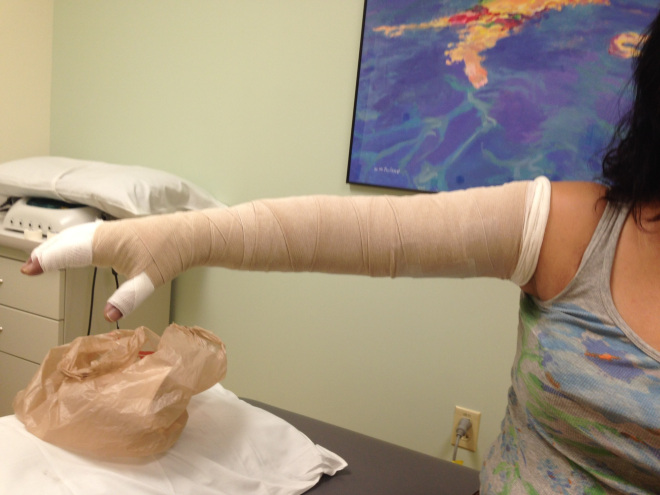 Lymphedema was caused by damage from my cancer treatments. I have to wrap my arm like this every night, applying compression to my arm to keep the accumulation of lymph fluid from swelling my arm into a scary huge mess: