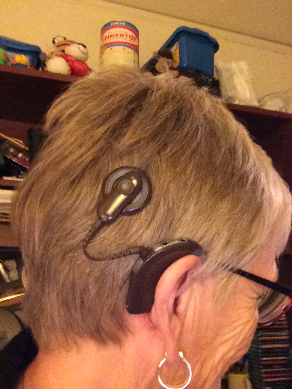 This is the receiver (behind my ear) that captures sound that travels through the wire to the round thing (which is actually a magnet) and transmits the signals through my skull to a twin round thing inside my head which then sends the signals along several wires to 22 electrodes hanging out in my cochlea. The electrodes recreate the function of the nerves in my cochlea, sending the sound signals to my brain to be made…
