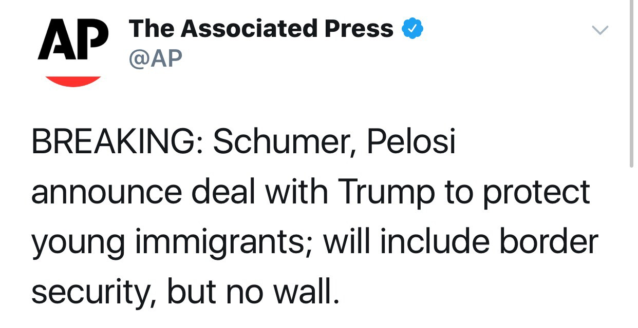 “We agreed to enshrine the protections of DACA into law quickly, and to work out a package of border security, excluding the wall, that’s acceptable to both sides,” ~ Senate Minority Leader Chuck Schumer and House Democratic Leader Nancy Pelosi