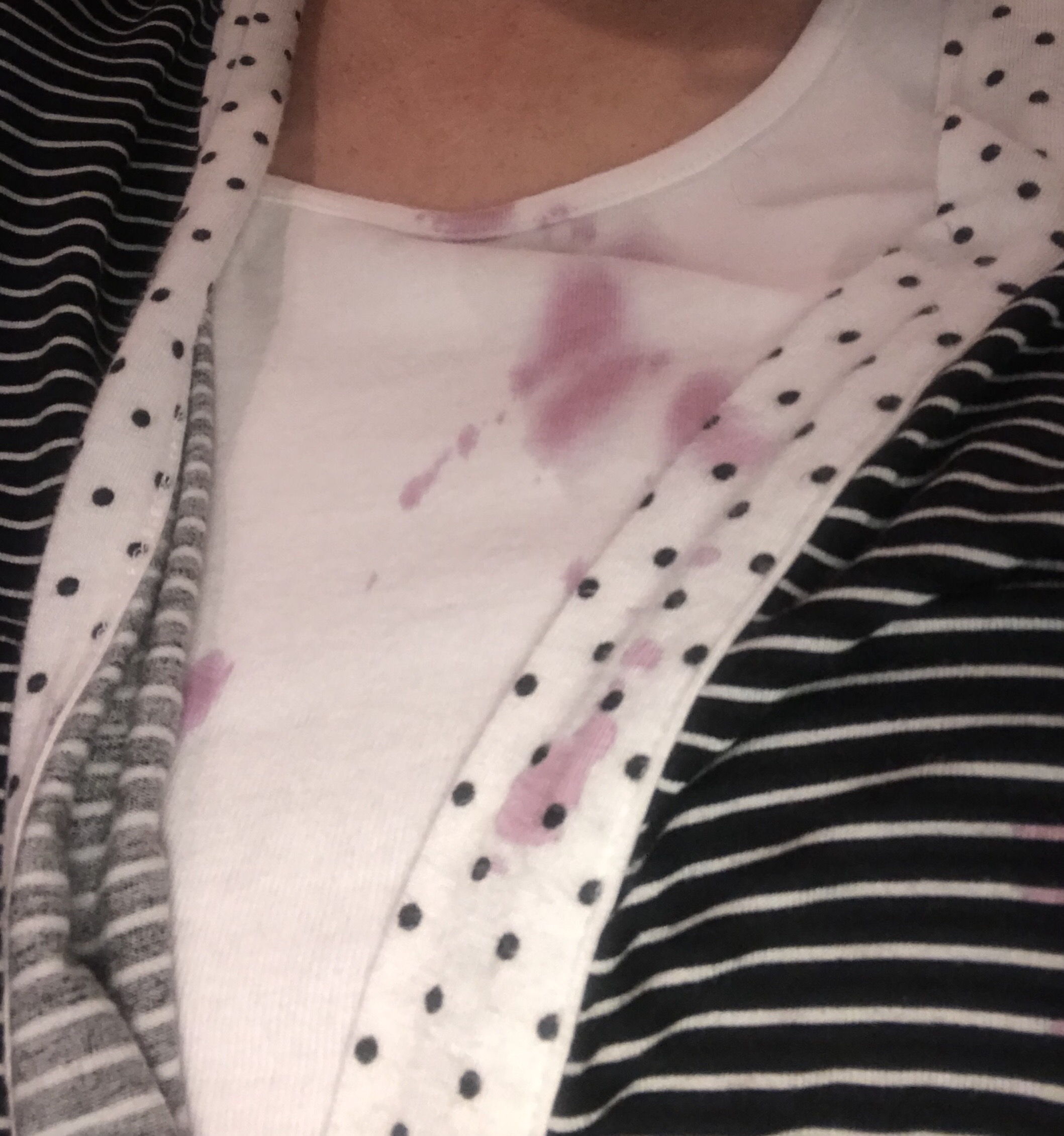 A red blend of course. Somewhere between the table and my mouth my wine took a detour, landing in a splatter pattern on my chest.