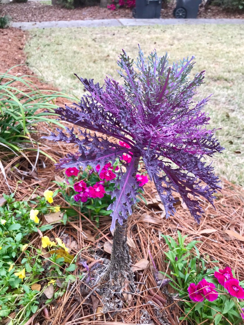 The blossoms aren’t on the plant itself, so kindly ignore them. Do note the purplish serrated looking leaves, and the oddly bare trunk-like stem. The plant is striking in its almost alien demeanor. I imagine if plants grew on Venus, this is what they’d look like.