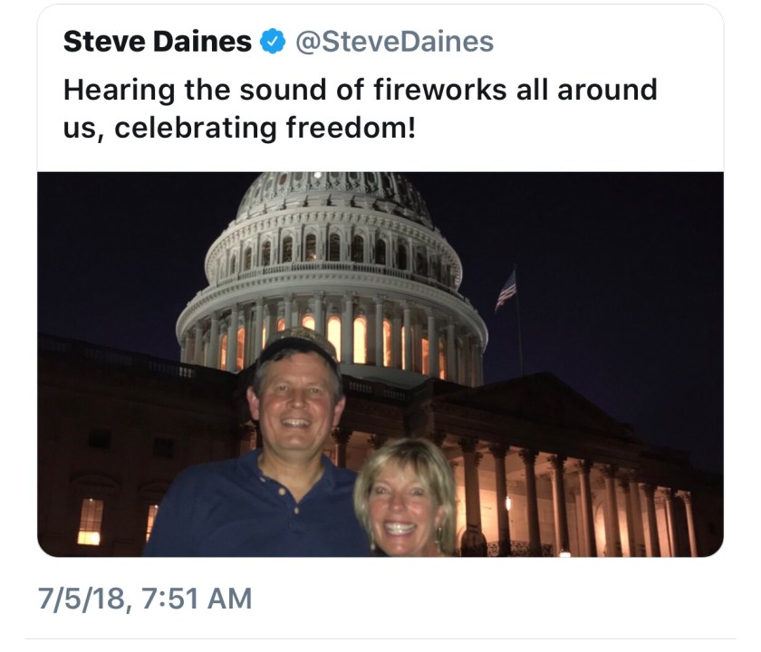 What a lovely photo of US Senator Steve Daines celebrating July 4, 2018, with his wife in DC… but wait… he was, and is, in Moscow. The event is being covered by U.S. and International Press, but he tweeted this photo today. Why is the Senator is implying he was in Washington DC celebrating America’s Independence on July 4?