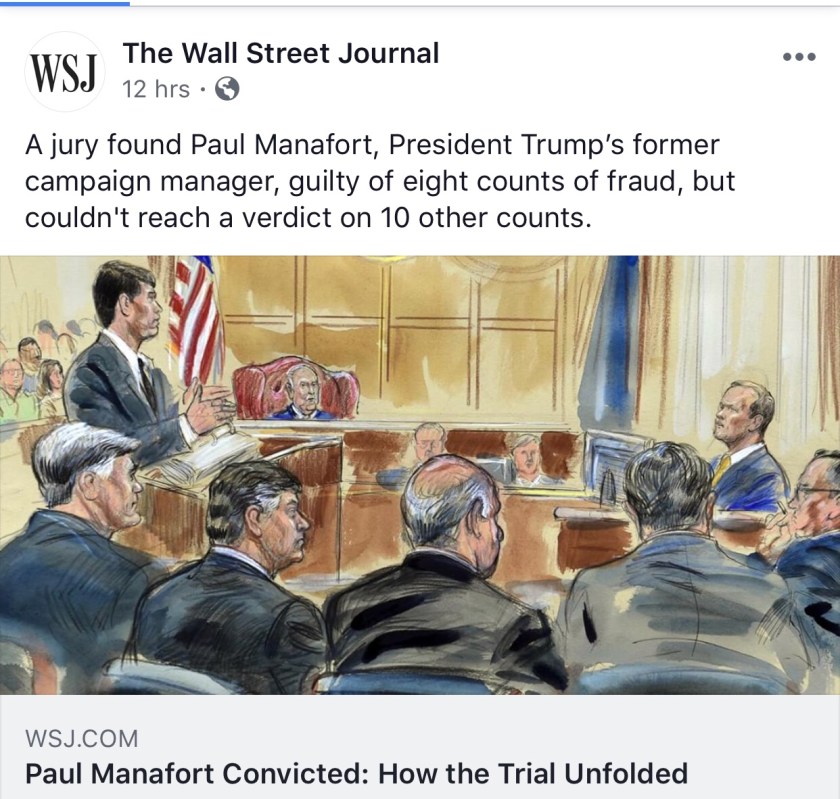 On Tuesday while all major mainstream news outlets were carrying word of guilty verdicts for Trump cronies, Paul Manafort and Michael Cohen, the ultra conservative media was singing a different song. Here’s what the Western Journal ran as “Breaking News”: