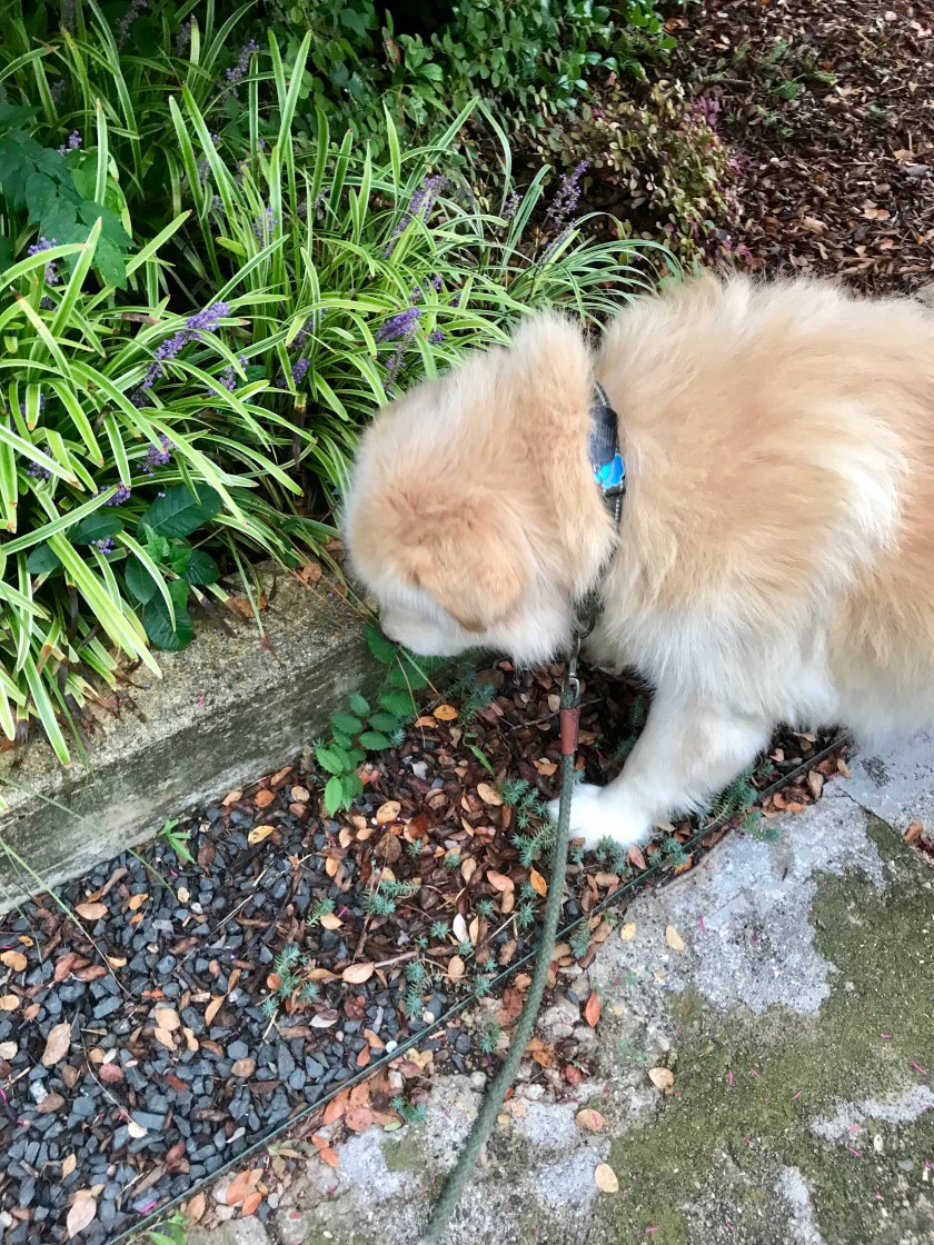 After Jason was safely gone, I allowed Toby to find his path, and he set a slow pace along the sidewalk. When one walks Toby, it’s more of a shuffle than a stride. The goal, of course, was to get him to poop, so when he slowed down even further and began avidly sniffing around a bush I got the poop bag out and was ready to clean up after him. I didn’t realize it wasn’t pooping he had on his mind.