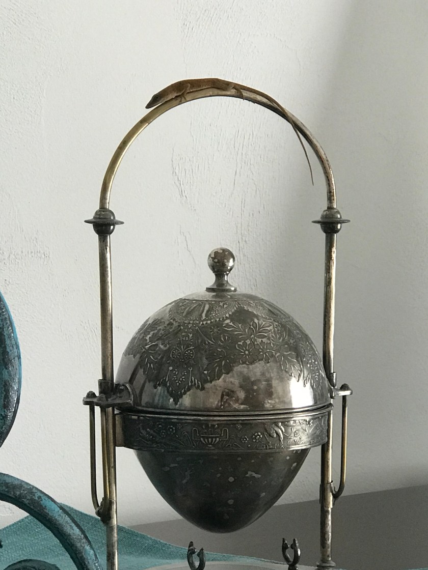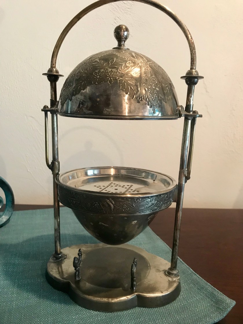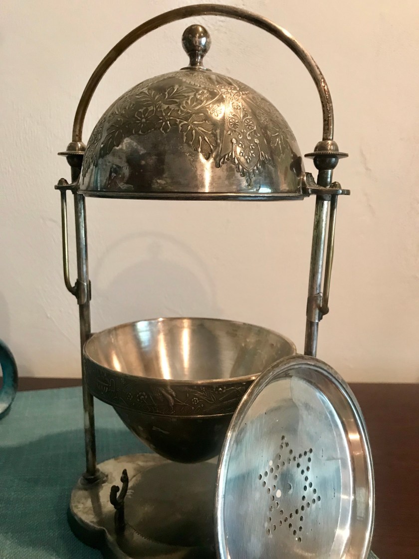 I truly believed that this silver piece was a butter server. One would put ice in the bottom section, place butter on the round piece, and lay that atop the ice filled bowl. The dome could be raised to serve, or closed to cover the food. A small spreading knife could be placed in the attached holder at the bottom. All very elegant and old worldly. And when I googled “antique silver butter servers” I saw this:
