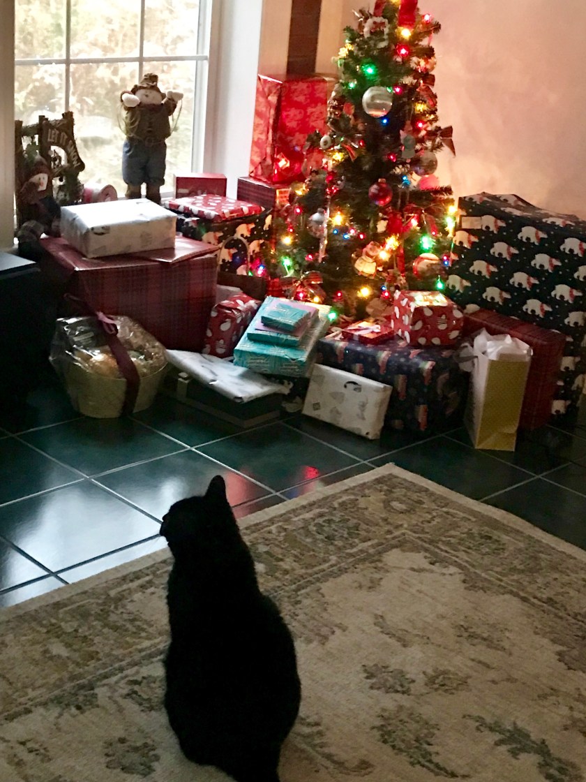Here’s Scout admiring the tree. It’s her shift. Patches is hiding somewhere.