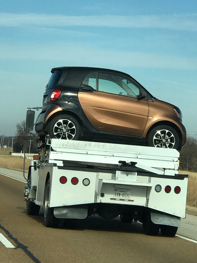 Studly called my attention to this odd sight as we approached the truck north of Springfield, Illinois. We pondered for many miles how this little car was loaded onto the bed of the truck.