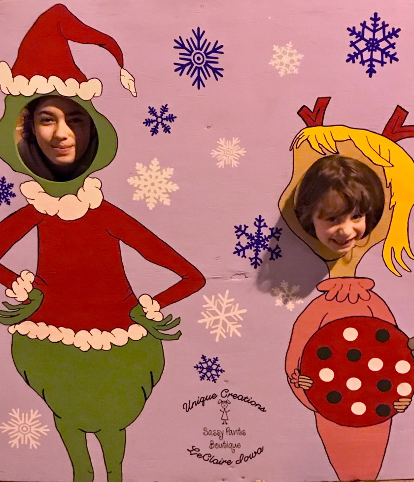 After getting the grandkids all riled up we headed to a pizza place across the river in LeClaire, Iowa, where we played pinball and Pac-Man, tried our luck with the claw game and the fortune telling machine while the pizza was being cooked. I was too busy playing to take any pictures, but I took this one of the granddaughters posing as the Grinch and Cindy Lou Who in front of a shop in LeClaire.