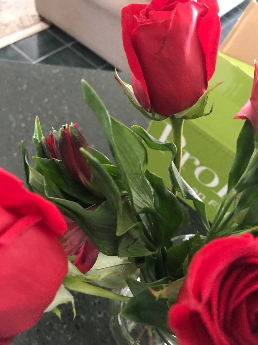 I was pretty certain my husband hadn’t placed an order saying, “Hey, I want the saddest bouquet of roses you all have in stock. Stems? Yeah, a bunch of stems are great. Even better if there’s a hint of petal remaining, you know, just to let her know they were ALMOST flowers.”