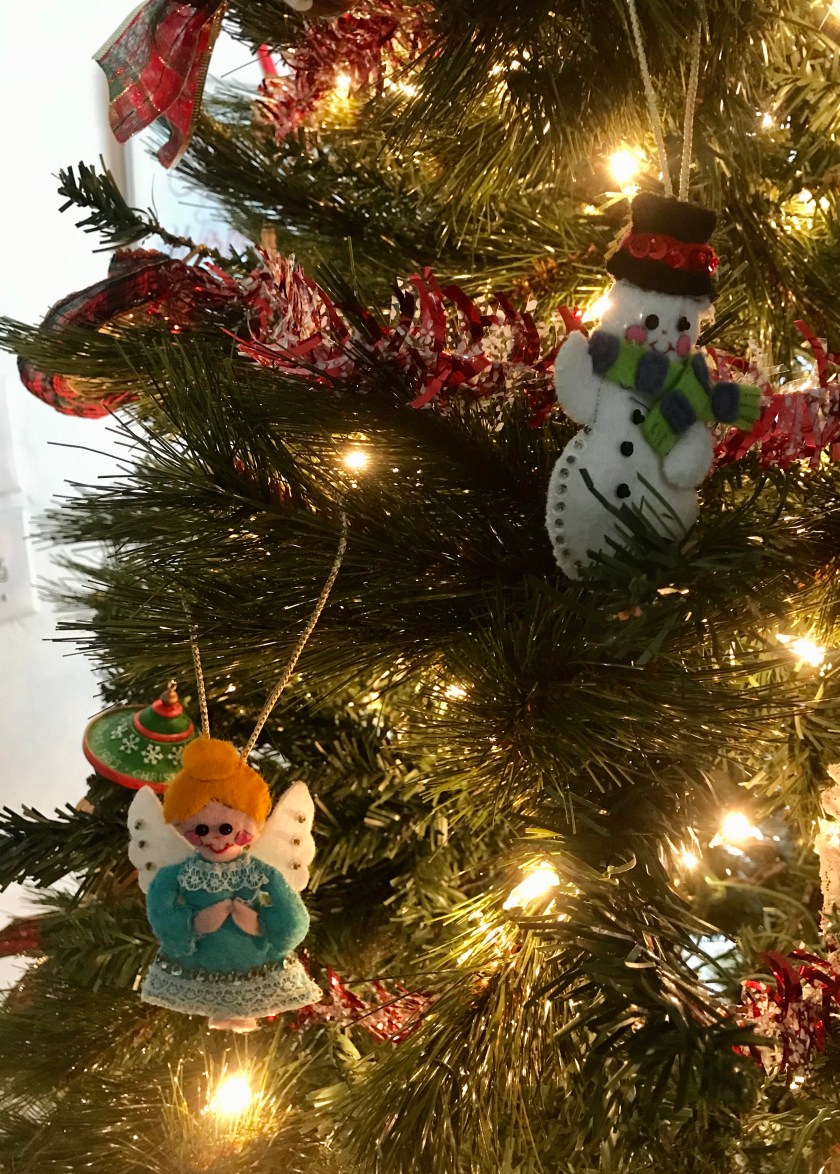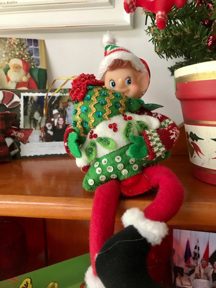 And I wondered why this poor felt tree came to be all by itself at the Goodwill store. Of course I bought it and brought it home. I introduced the ornament to its counterparts on my tree, and then I let our elf on the shelf comfort it.