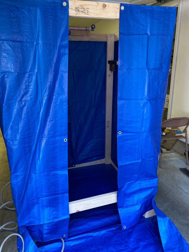 We have to close the garage door most of the way so no one sees us naked, but not all the way so the water has a place to flow.