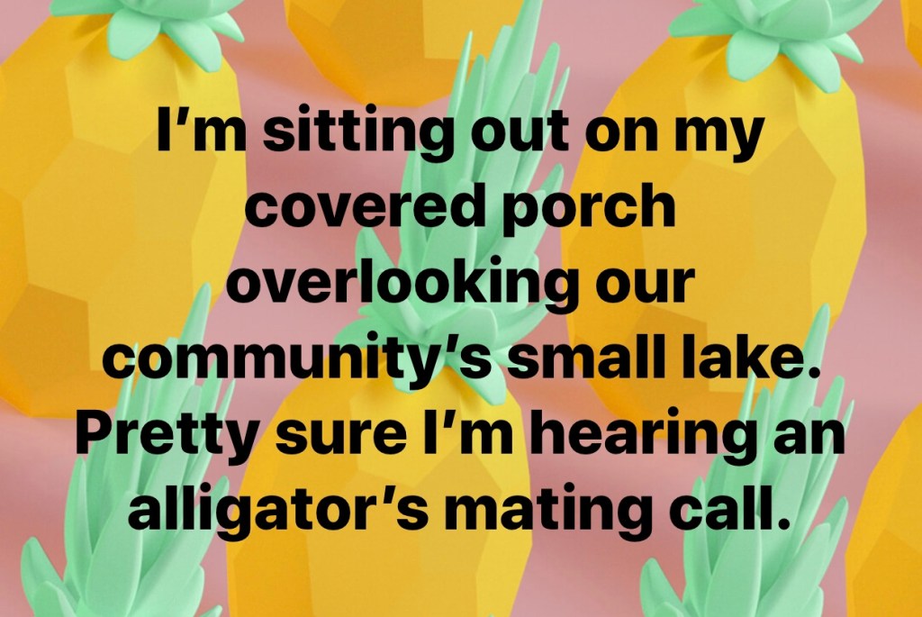Yesterday I posted that I’d listened to an alligator’s mating call while sitting on my back porch. A reader asked what an alligator’s mating call sounded like, so here you go: