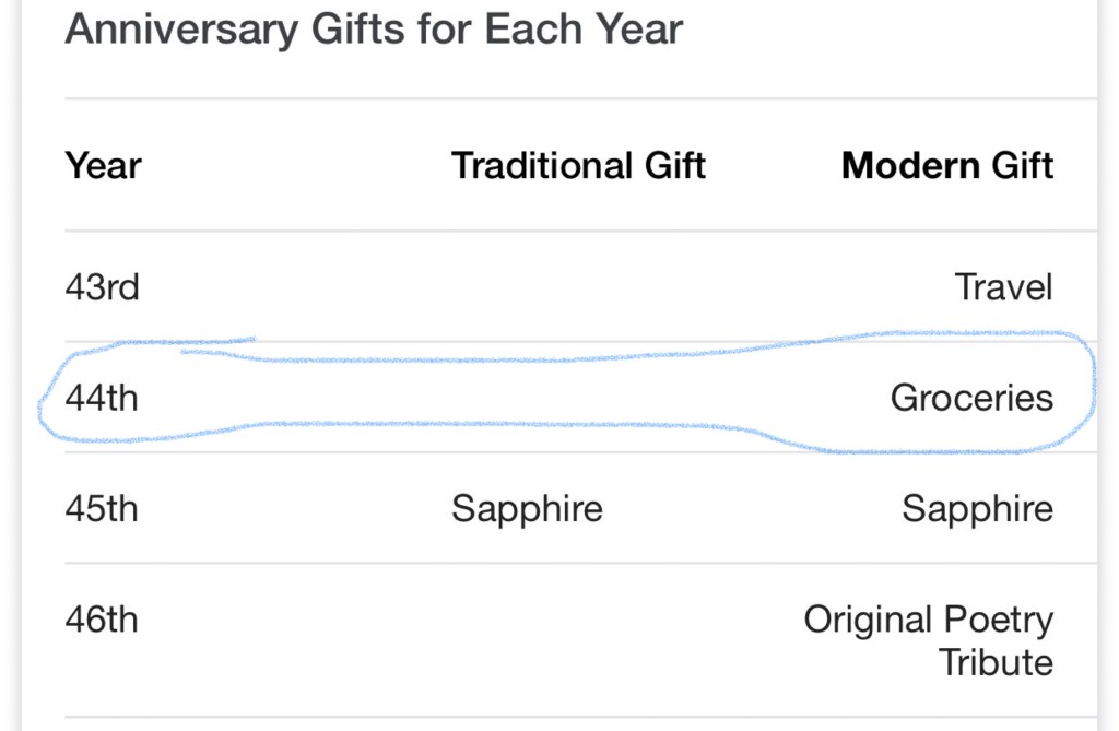 I’ve had his gift for several weeks and will give it to him tonight. This morning, though, I was curious as to what the prescribed gift for the 44th anniversary might be. Maybe, I thought, I’d pick up something that fit the bill in addition to what I’d already bought.
