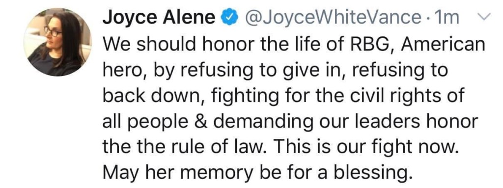 I am totally bereft at her passing. Her accomplishments were an inspiration to me during my entire adulthood. And in this last year while I’ve been undergoing cancer treatment, she continued to motivate me. At each chemo session I thought, If RBG could do it, so could I. I bought my grand daughter a RBG doll and paper doll cut out set a while back. I hope As she grows up she will be as Inspired by her as I was.