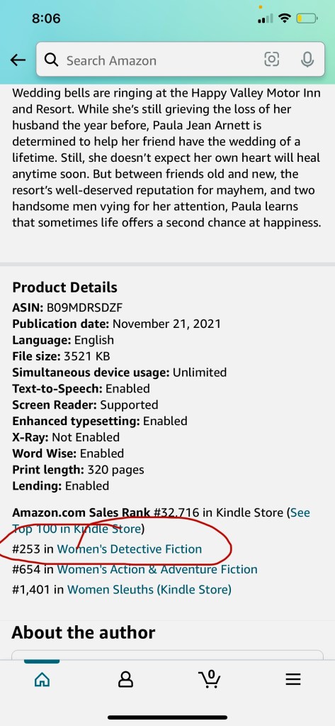 Look at this! Okay, it’s not in the top 100, but Wedding at the Happy Valley Motor Inn and Resort just came in at #253 in Women’s Detective Fiction. That’s because of you, dear readers. Thank you!
