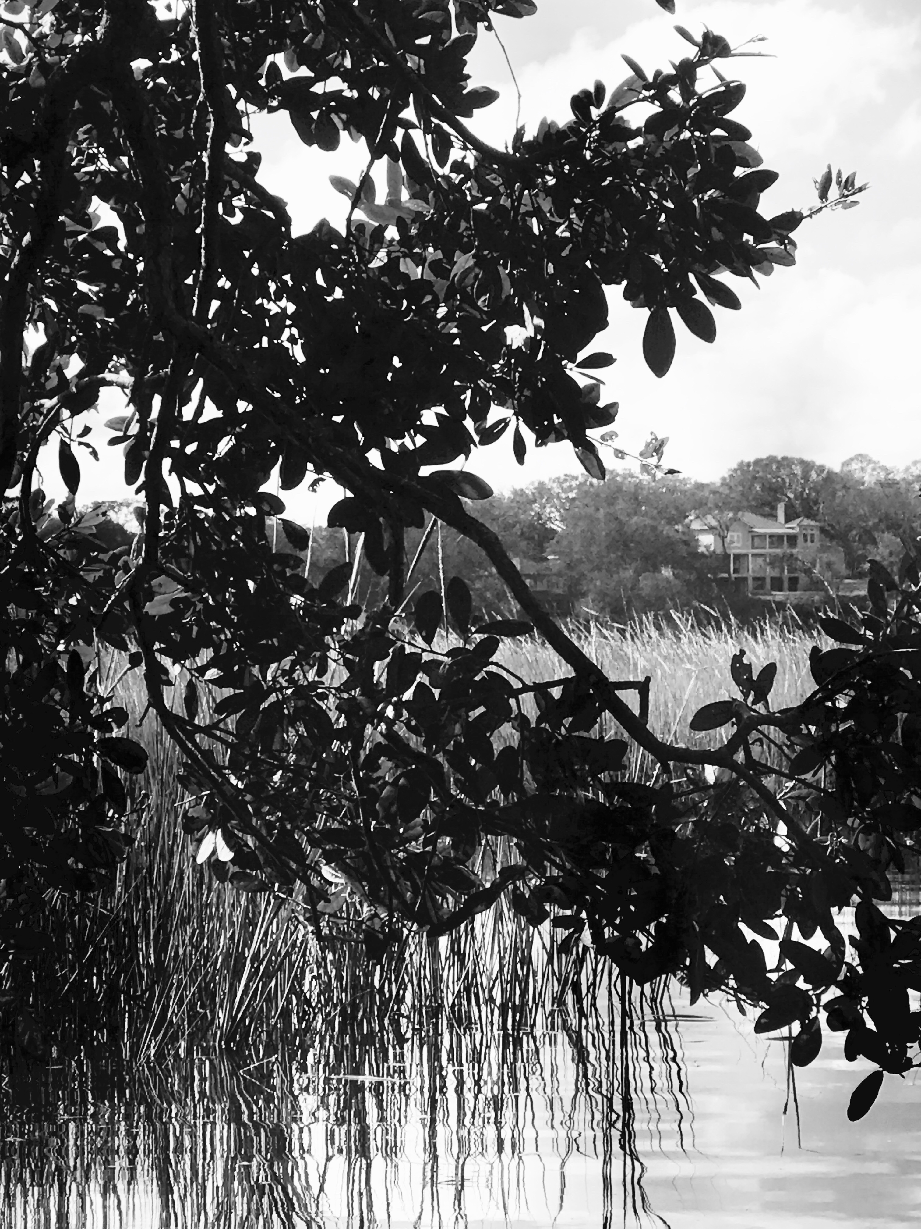 Another photo taken on Amelia Island showcases the swamp we kayaked through on a recent visit. That house in the background looks a bit haunted shown in black and white.