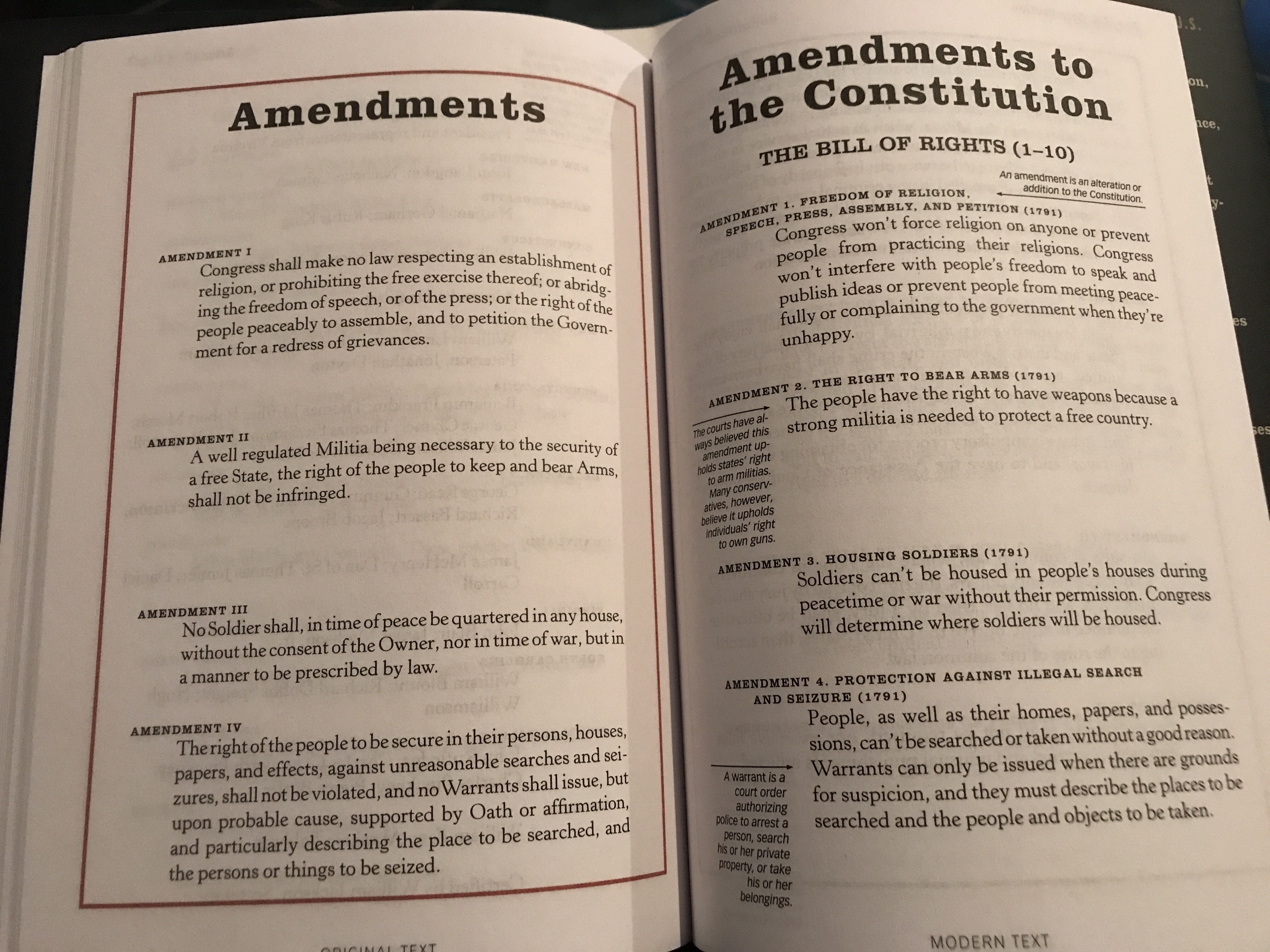 I like the way the book has side by side explanations of the documents. For example, pictured below is the first page of the Bill of Rights: