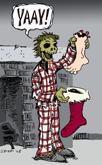 They film their segments about Christmas while gamely shooting zombies and subsisting on canned foods they’ve scavenged from abandoned homes. The beautiful young reporter learns to love Christmas and falls in love with her handsome producer. Unfortunately, they’re both attacked by zombies and become walking dead themselves.