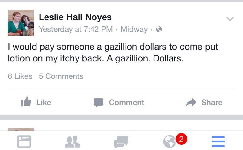 The interesting thing that occurred following that post was the number of rather lascivious offers I received on my private message board. So many that I ended up deleting that app from my phone. Who knew that my itchy back could inspire so many perverted responses?