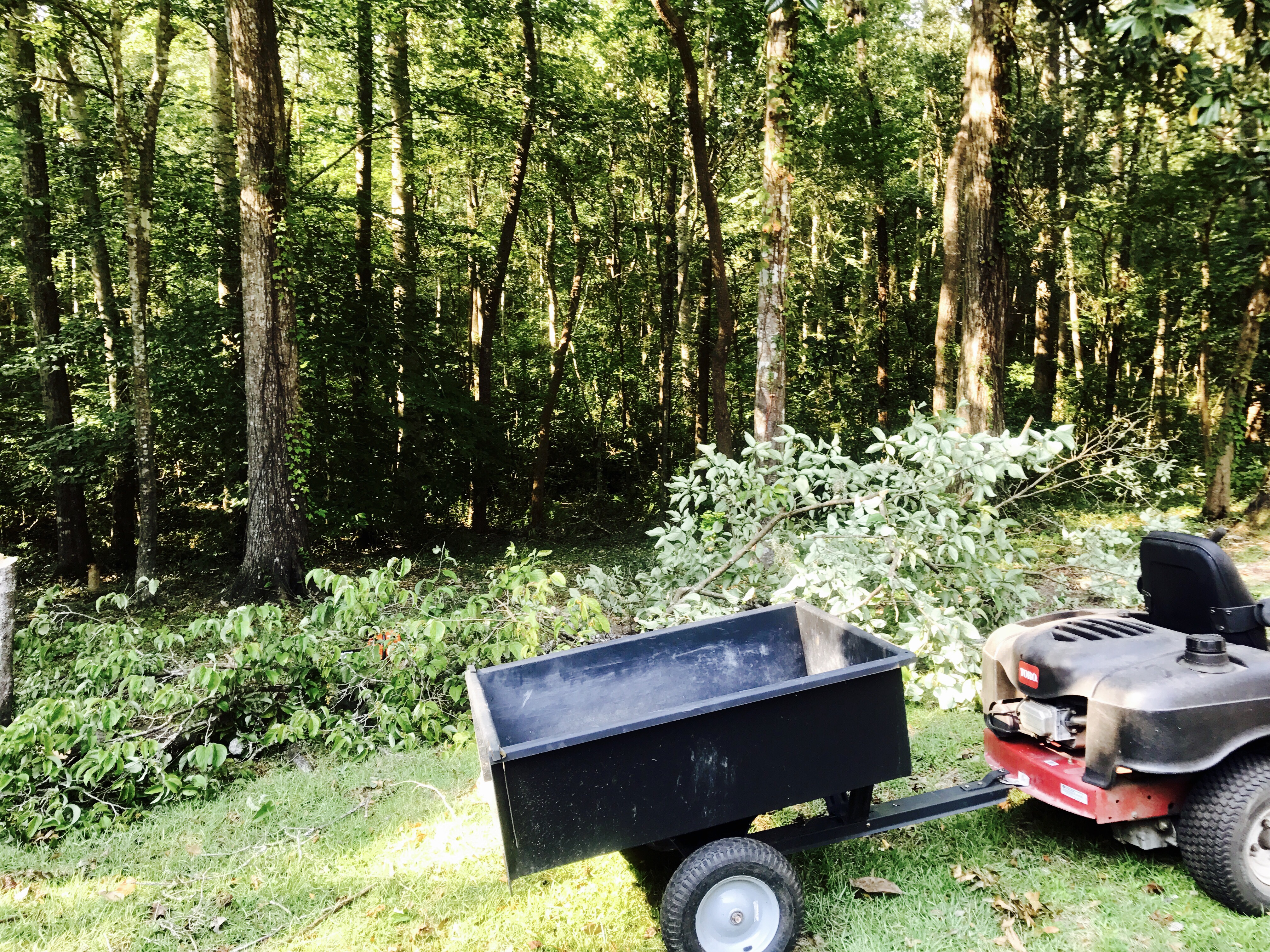 McKayla piloted the riding lawn mower around the yard, collecting fallen limbs and other forest detritus, including her sister.