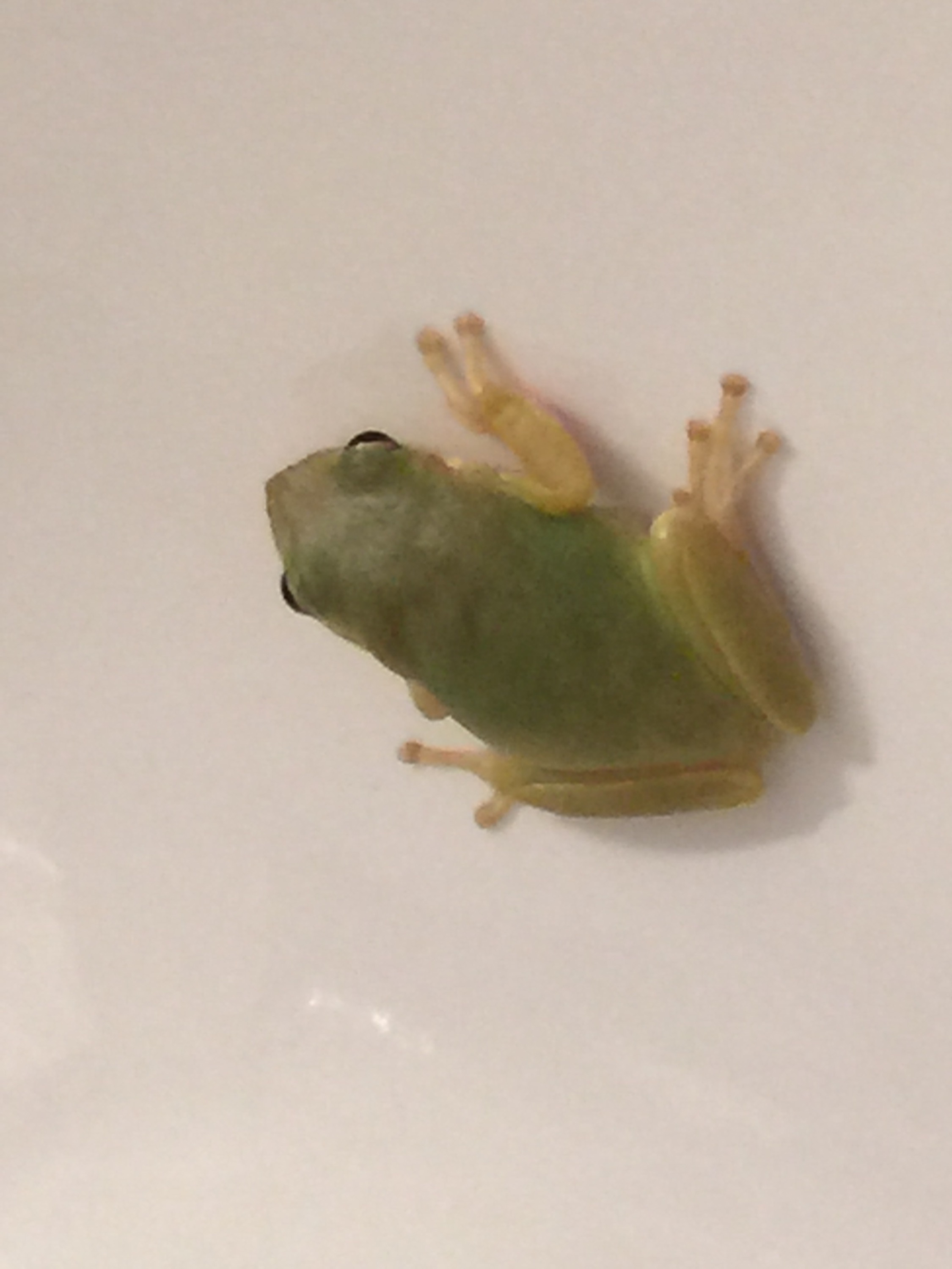 Now, I didn’t shriek, but I did giggle as I imagined this little guy pinging off of my butt and onto the toilet.