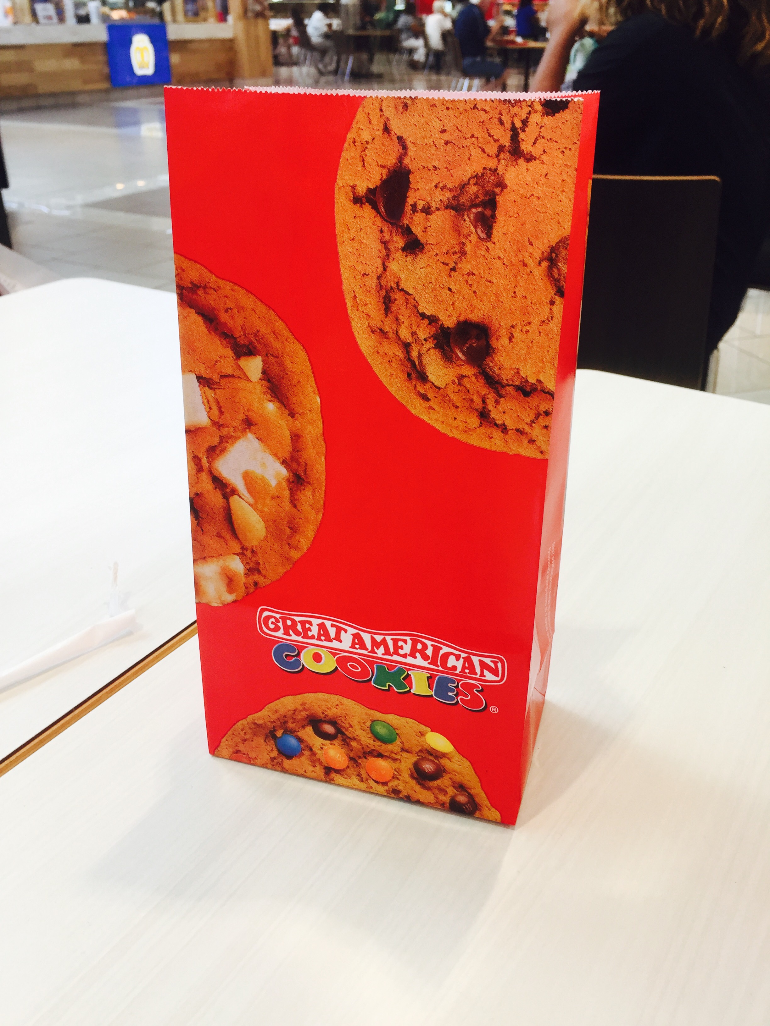 A rumble of thunder and a darkening sky hastened me on my way to my car, but I wasn’t ready to return to Doright Manor quite yet. I drove to Governor’s Square Mall, parked in the parking garage, and then wandered aimlessly for awhile. Then the Great American Cookie Company in the food court started calling my name. For awhile I was able to tune it out, but then it got really obnoxious and I had to have a chewy pecan supreme cookie to quiet the voices. I hate it when that happens.