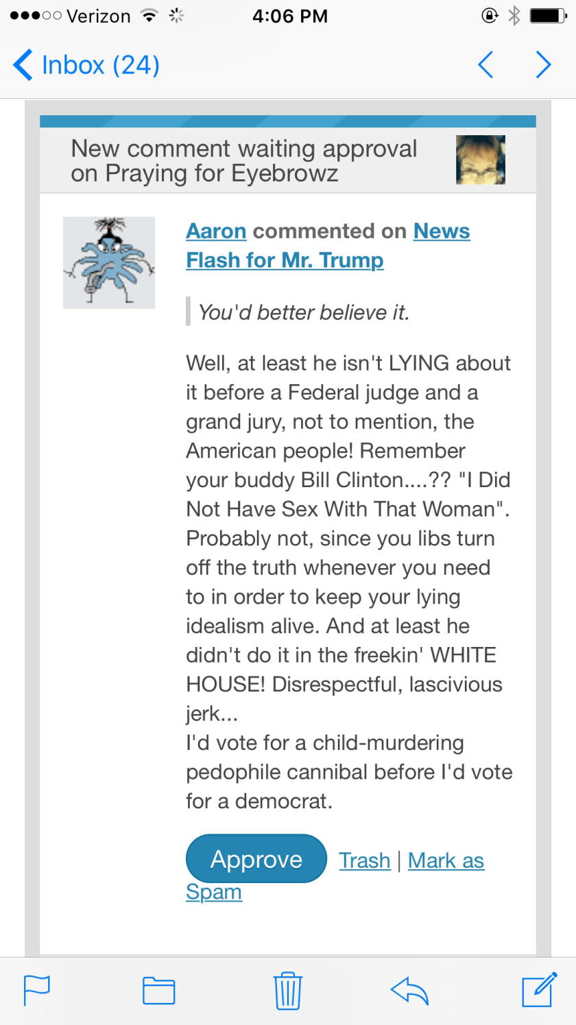 Now I didn’t approve his comment, and perhaps I’m giving him way too much attention by sharing his comment here, but I think it’s important that we acknowledge the sheer hatefulness and evil that is out there. And guess what? It’s all in the Trump camp.