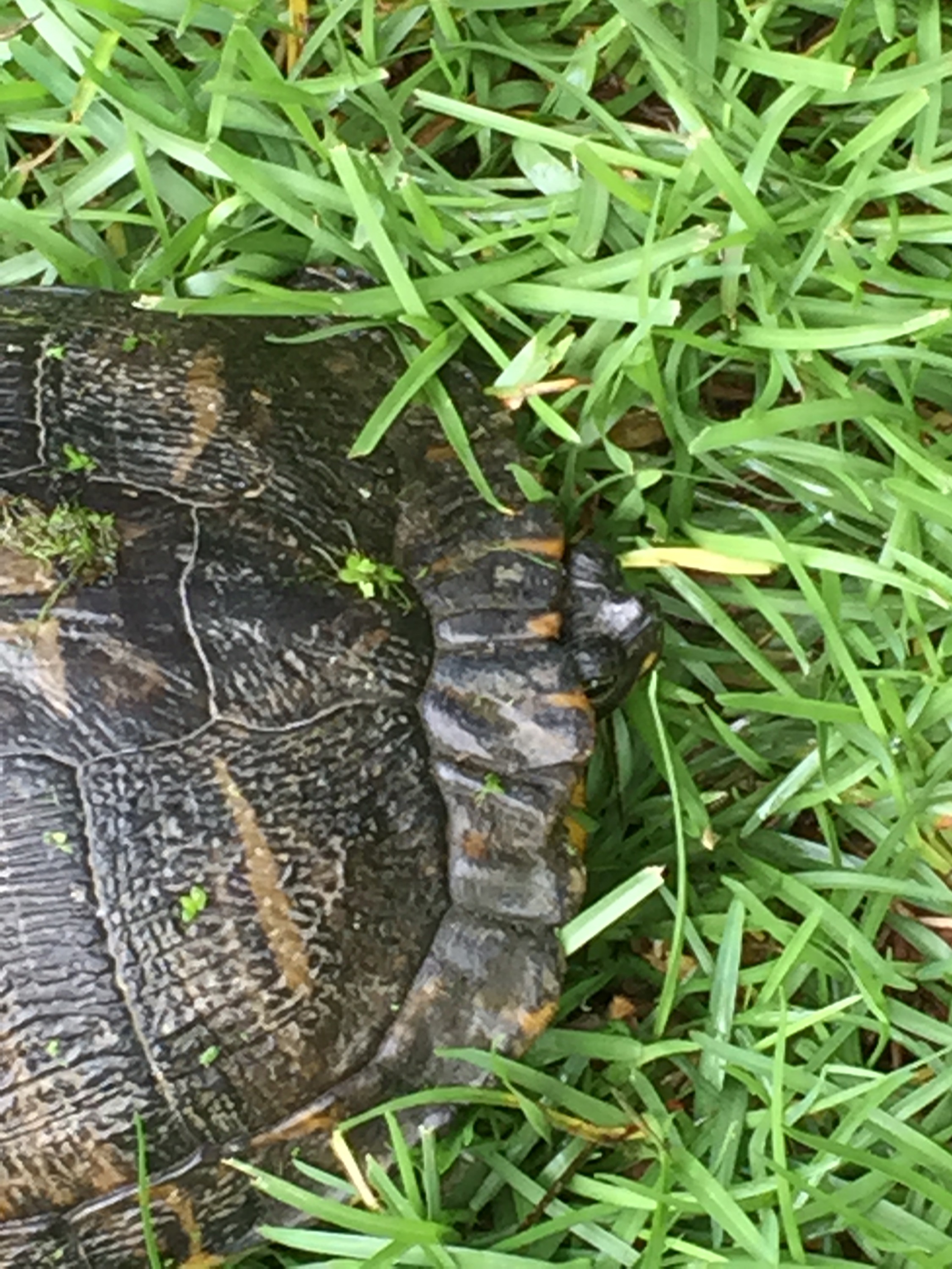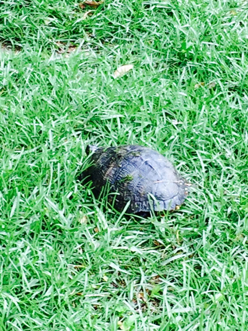 I wanted to get a closer look, so I threw some jeans and a t-shirt on and hurried outside hoping he hadn’t had time to hide. A turtle can be surprisingly fast.