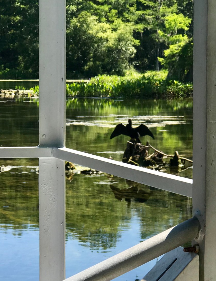 Above, framed by the boat’s scaffolding, is one of my favorite birds, the anhinga. Anhingas swim quite well, but they have to spread their wings to dry them upon leaving the water; otherwise, they’d be unable to fly. When anhingas swim only their heads and slender necks appear above water, giving them the appearance of snakes and earning them the nickname, snakebird.