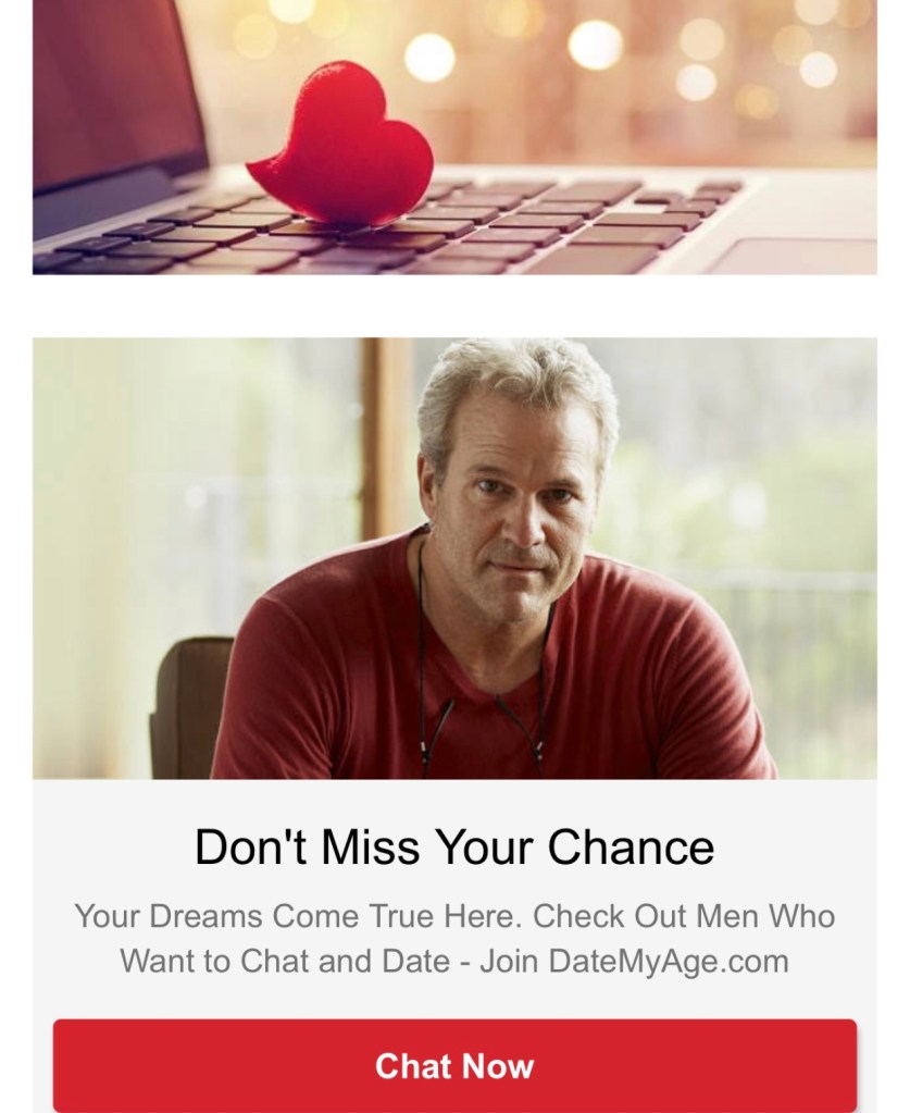 For some reason I’ve been getting ads for internet dating sites. I’ve wondered if some of the google searches I embarked on while writing my little romance novel triggered the algorithm for “MatureLove.Com” or something similarly inappropriate for a married woman to be perusing. Whatever the reason, the ads have been interesting.