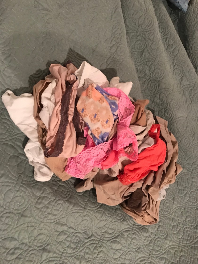 Today I’m performing a panty purge. A pile of 27 panties for your perusal, plucked from the pleasantly perfumed place reserved for some pretty, but mostly plain, underpants. Perhaps I should keep the pink pairs? Nope. They won’t stay put on my patootie.