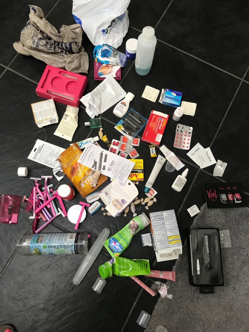On Thursday I kept my promise. I reorganized the cabinets and drawers in all of our bathrooms at Doright Manor and came up with way more than the 118 items needed to satisfy the challenge for days 28, 29, 30, and 31. Inside one pill bottle alone there were 89 pills (I had taken one of the 90 prescribed and suffered terrible side effects).