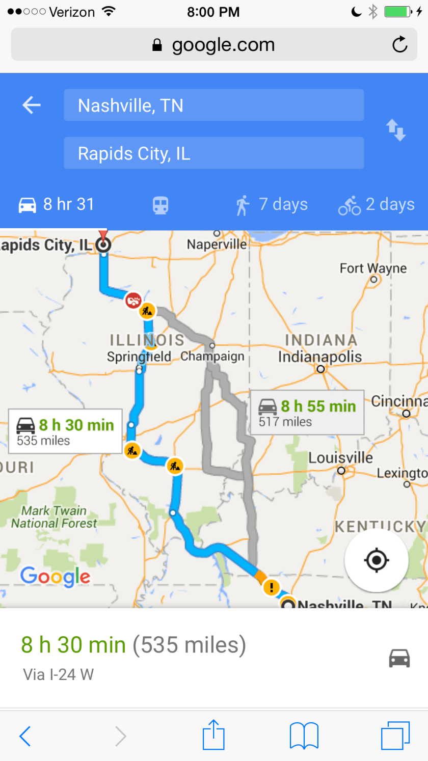 My first destination is a point north of Nashville, Tennessee, for an overnight stay. From there I’m bound for our daughter’s home in Rapids City, Illinois, where I will be baby sitter-in-chief for my daughter’s three children while the parents go to cavort in the bright sun of a Mexican beach.