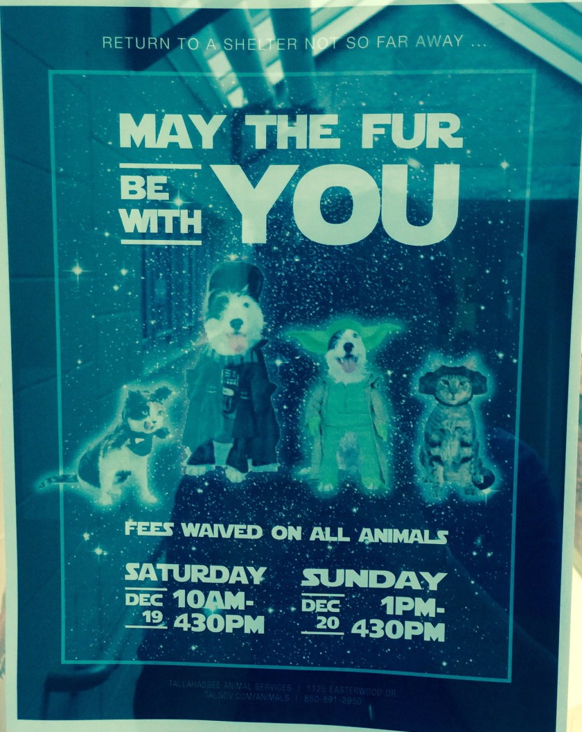 Come find your best friend at Tallahassee Animal Services this weekend! Fees on all adoptions have been waived for this Saturday and Sunday for a special, May the Fur Be With You event.