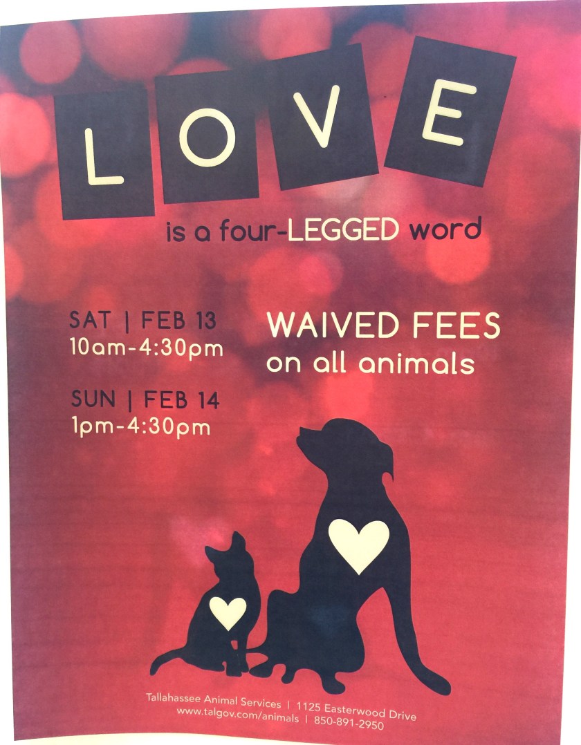 This weekend at Tallahassee Animal Services fees are waived on all animal adoptions. That means you could have a Valentine this Valentine’s Day and every day for many years to come. Without the calories of a box of chocolates!