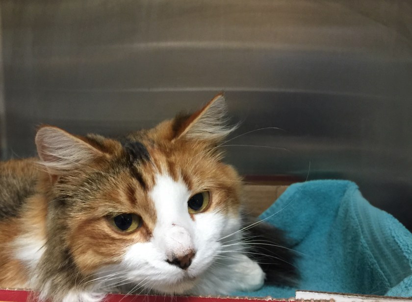 I couldn’t locate a veterinarian right away, so I hurried back to the cat kennels to assist potential adopters and to take care of the resident cats, but Cake was very much on my mind.