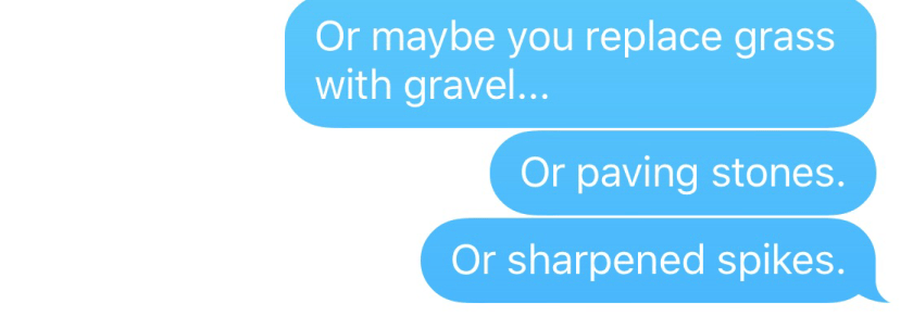 Granted, the spikes might be ill-advised, and we are animal lovers, after all. My friend did say they’d tried spraying wolf urine around the edges of their lawn with no success. Can you imagine going into the local feed and seed store and ordering thirty gallons of wolf pee? And having that pee fail to do its job?