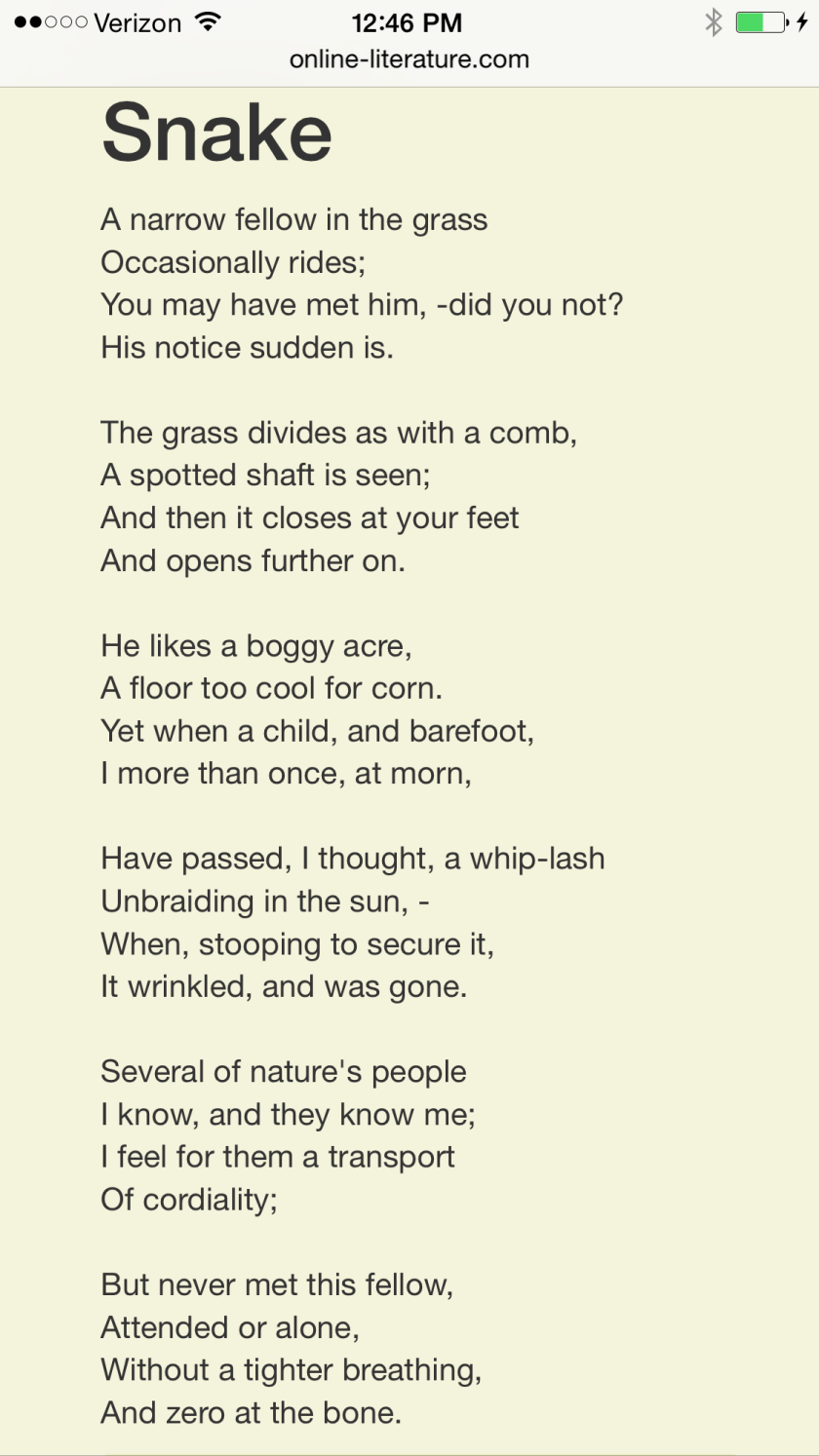 Oddly enough I’d had Emily Dickinson’s poem, Snake on my mind this morning, so I snapped a photo of it from the website online-literature.com.
