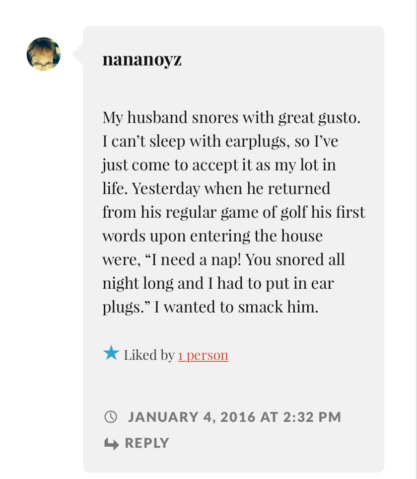 My friend and fellow blogger, Bun, posted a wonderful piece about snoring, and sleeping, and the sheer beauty of relationships based on many years of studying each other’s quirks:
