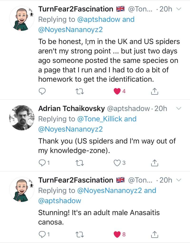 Seriously, I had a horrifying experience with a spider when we lived in Kansas. I dreamt that I was eating a salad. The lettuce was crisp and crunchy. When my alarm went off I could still hear the crunching of the lettuce, but it was coming from inside my head. I thought, “oh hell, I’ve lost my mind!”