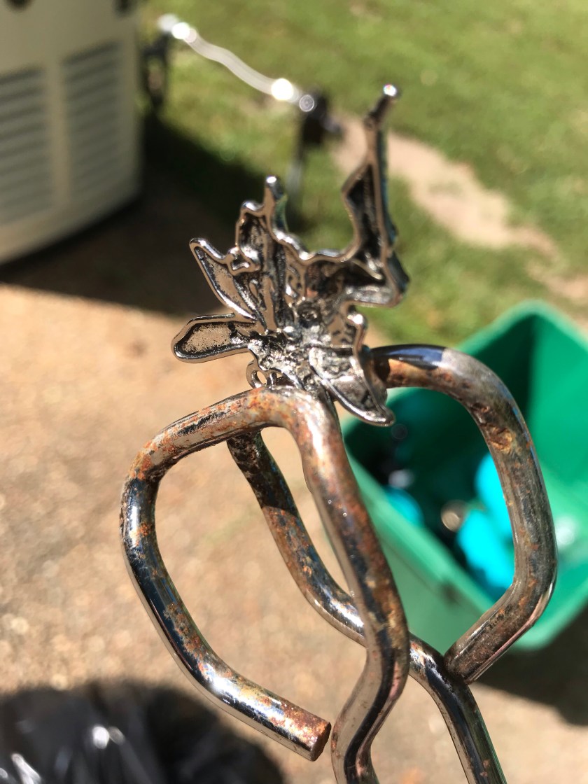I was dressed to go into town, so I wasn’t about to climb into the dumpster. Instead I ran into the kitchen, retrieved the tongs, went back out side and…still couldn’t reach the pendant. Against my better judgement I pulled a chair over to stand on so I could better lean into the dumpster without touching the sides. Amazingly I was able to reach the pendant and pulled it to safety: