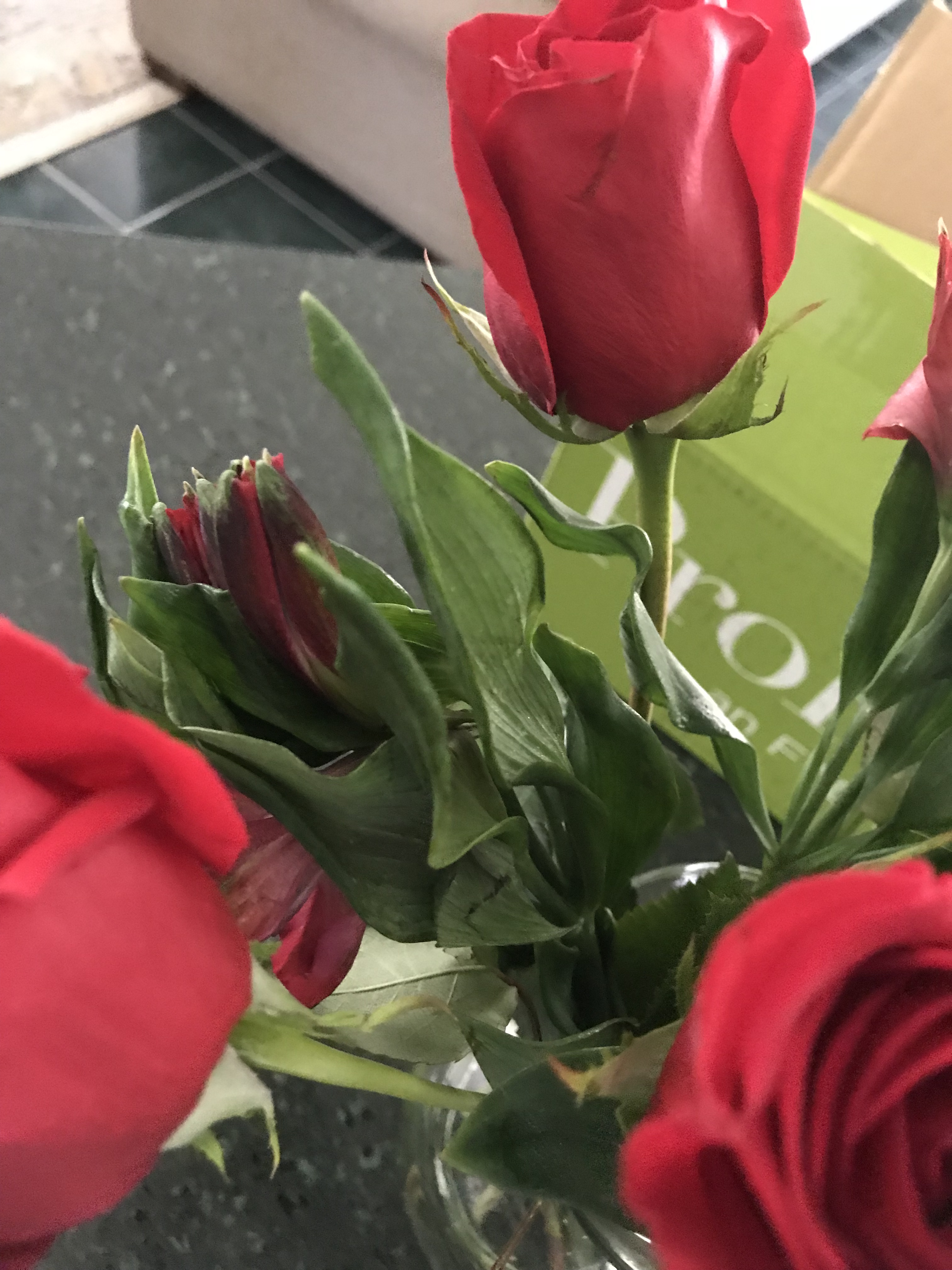I was pretty certain my husband hadn’t placed an order saying, “Hey, I want the saddest bouquet of roses you all have in stock. Stems? Yeah, a bunch of stems are great. Even better if there’s a hint of petal remaining, you know, just to let her know they were ALMOST flowers.”