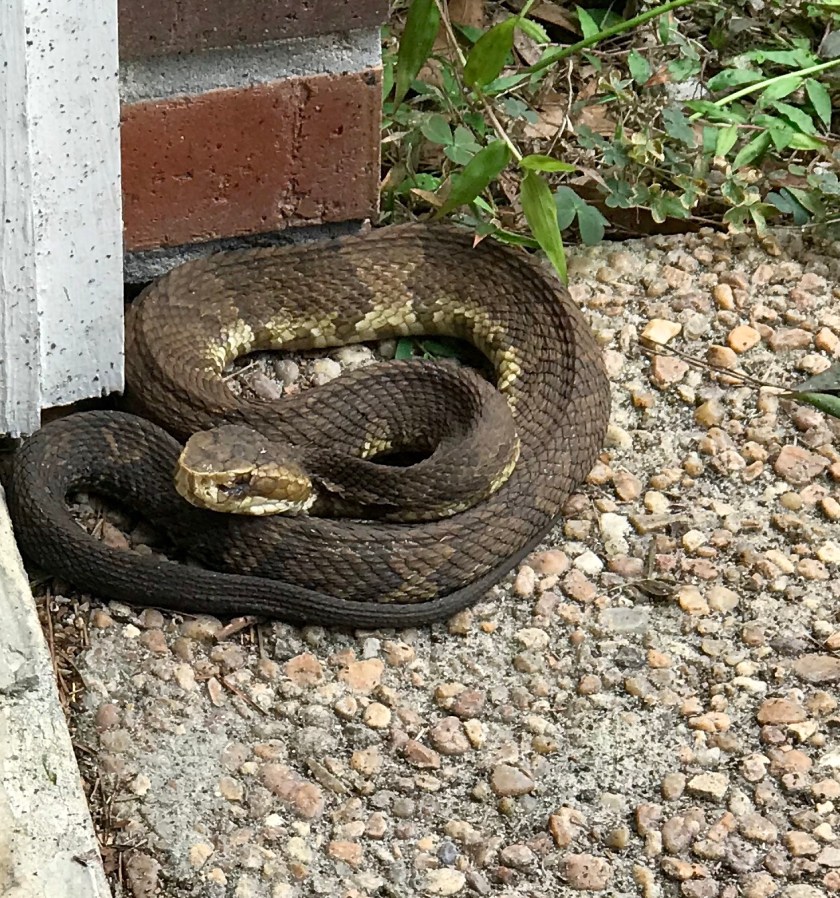 The night following the encounter that cottonmouth occupied my dreams every time I closed my eyes to sleep. In my waking hours I mentally retraced the steps I took prior to noticing his presence next to the garage and realized I’d likely come within inches of stepping on him. It was a sobering thought.