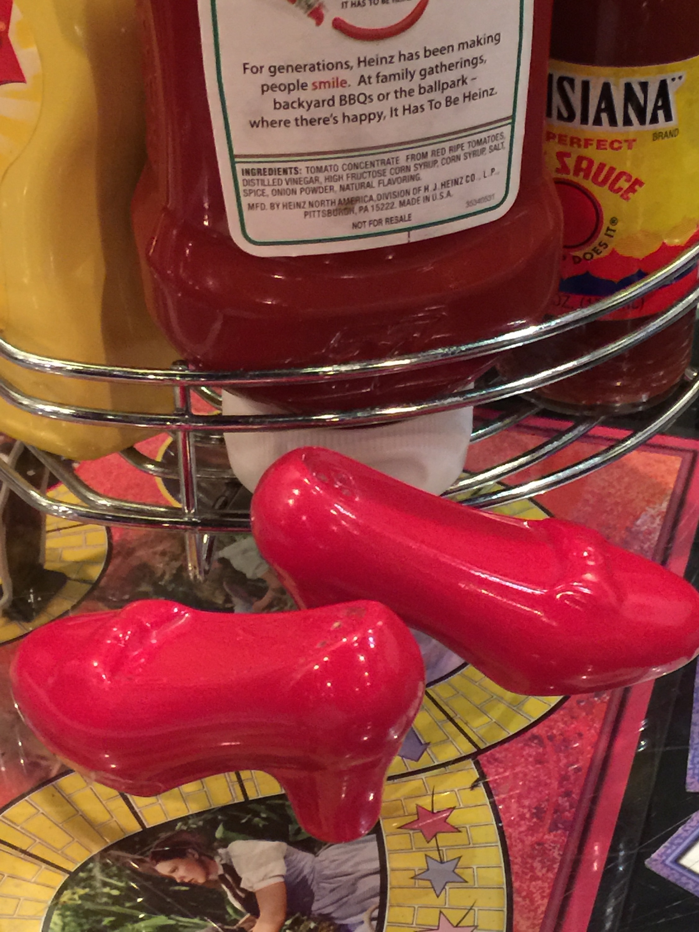 Many tables are decorated to represent various states. We sat at the Kansas table where Dorothy’s ruby red slippers served as salt and pepper shakers, while a Wizard of Oz game under glass added to the theme.